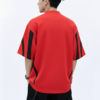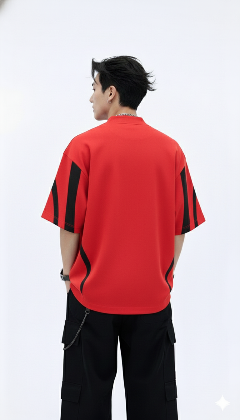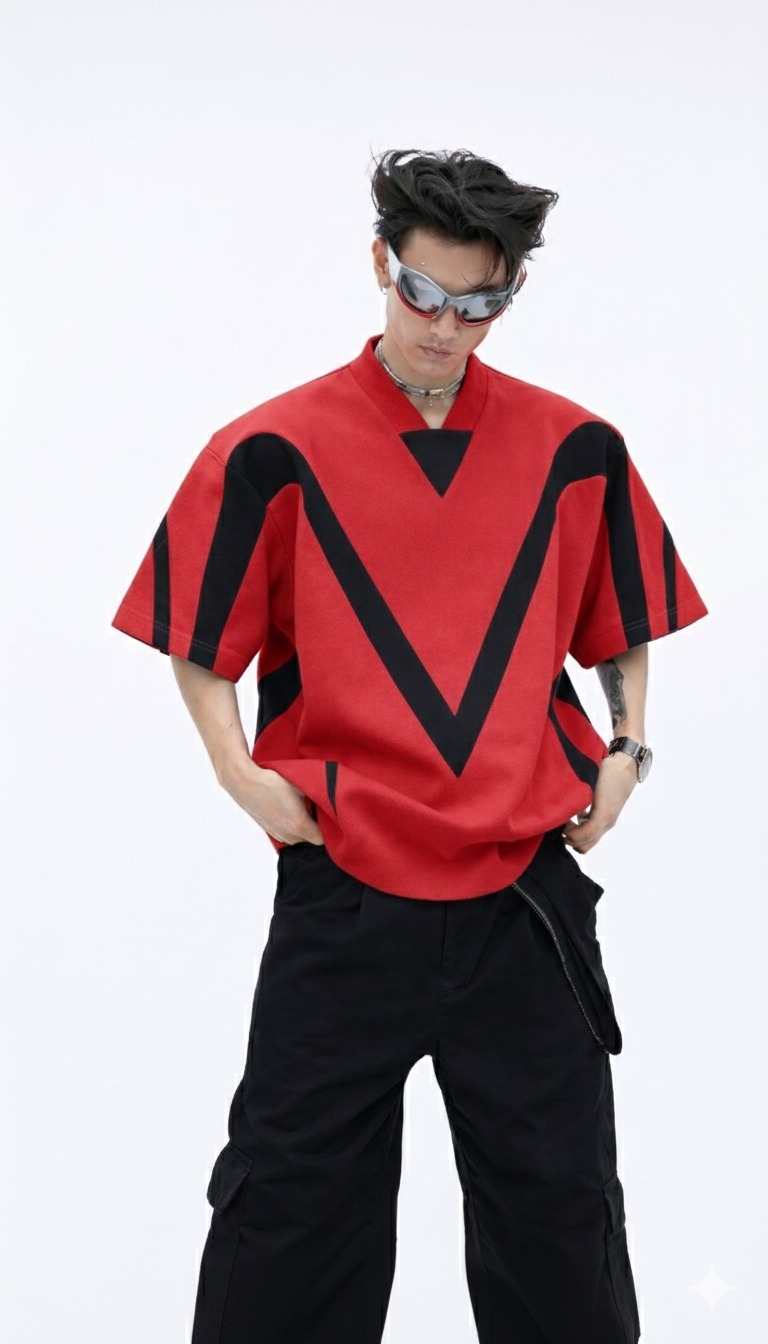 Make a bold statement with this men’s oversized red graphic T-shirt, designed for modern streetwear lovers. Featuring a striking black V-shaped geometric print, this tee delivers a powerful urban look with a relaxed oversized fit for maximum comfort.